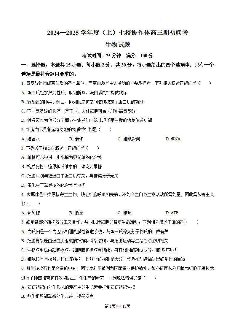 辽宁省2024-2025学年度(上)七校协作体高三期初联考 生物