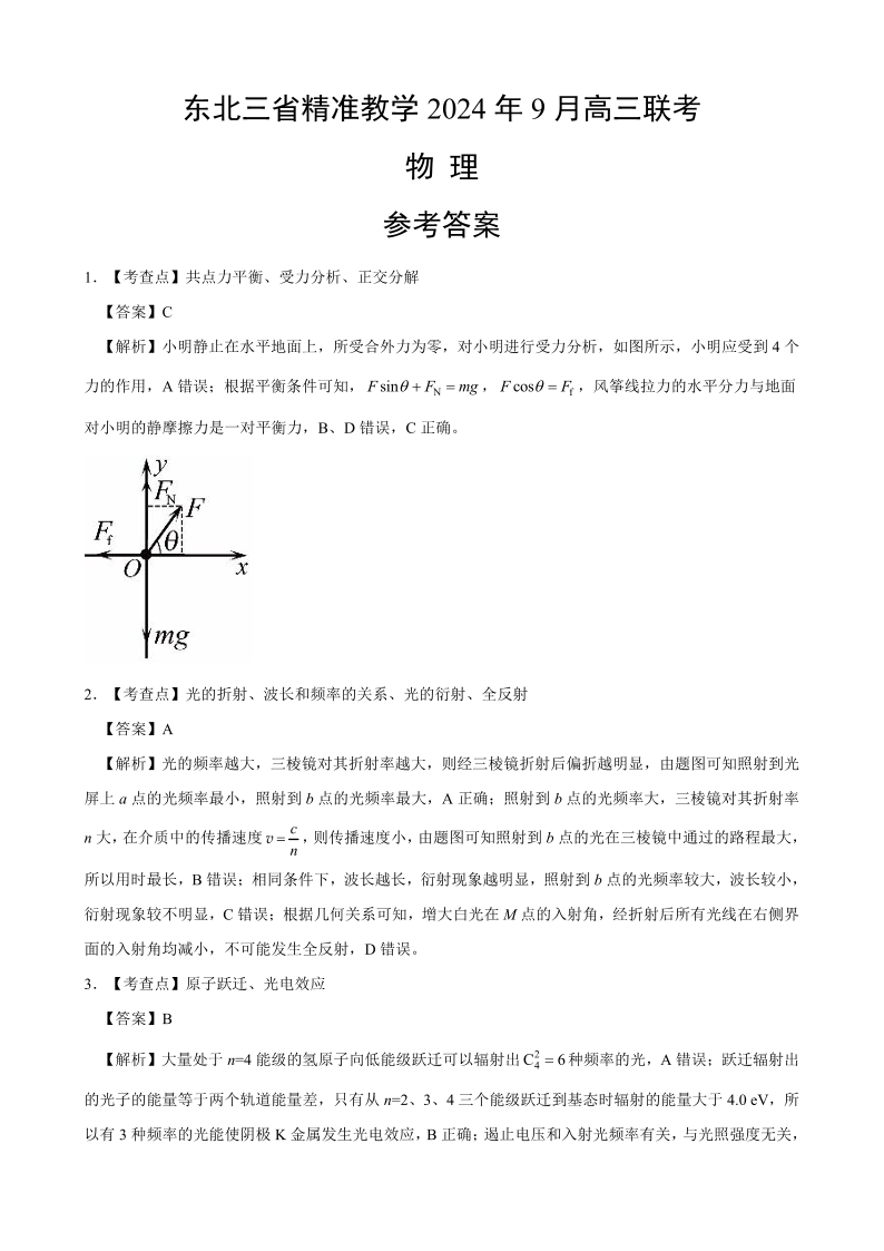 东北三省精准教学2024年9月高三联考 物理答案