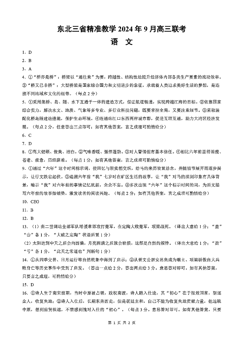 东北三省精准教学2024年9月高三联考 语文答案