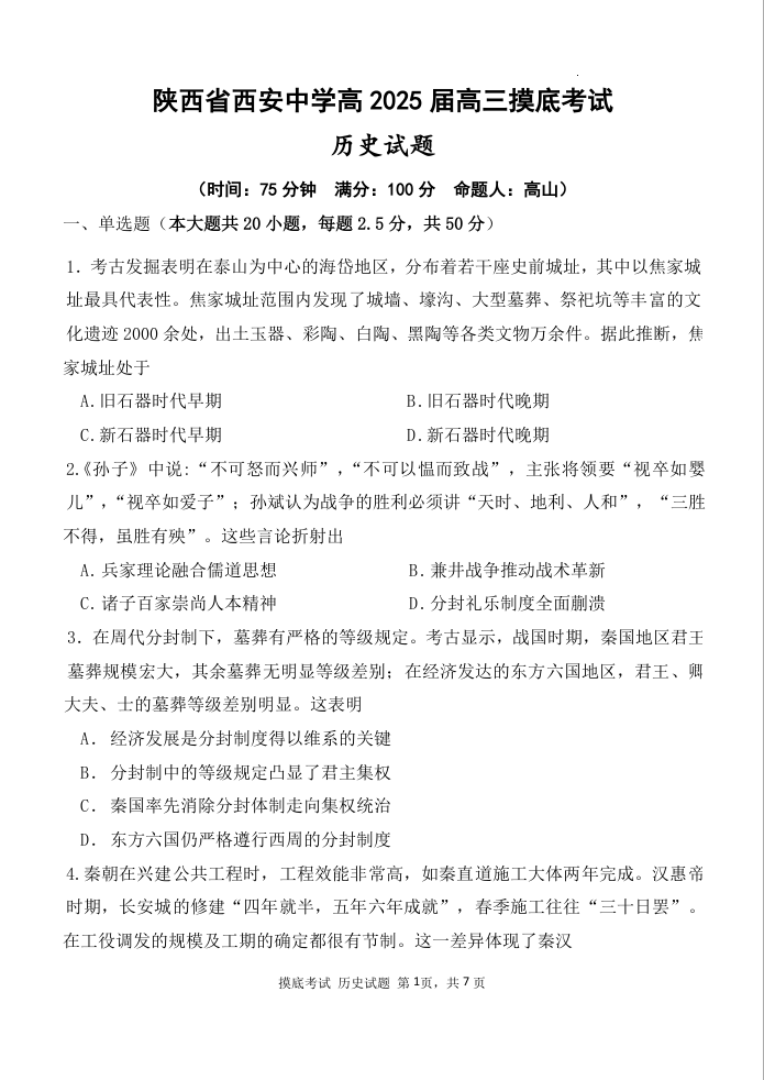 陕西省西安中学高2025届高三摸底考试 历史