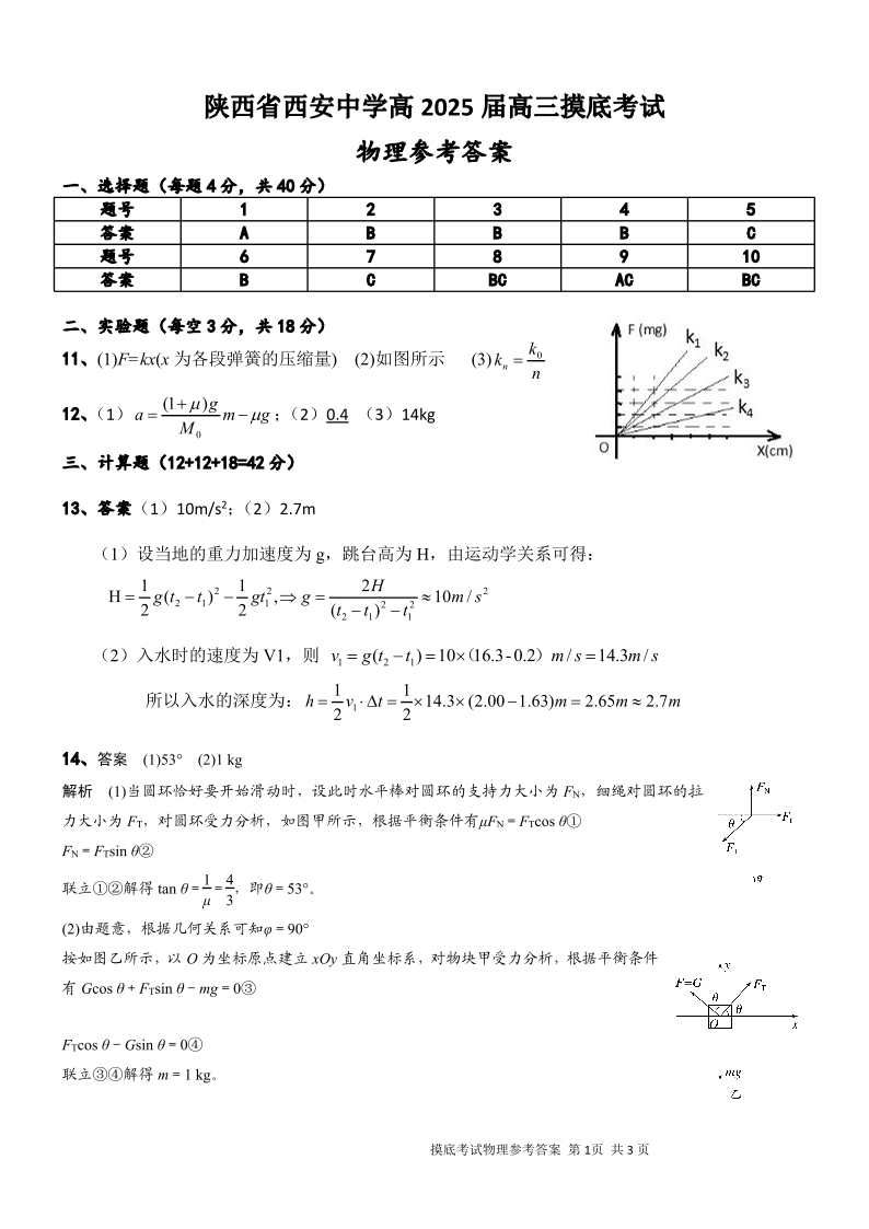 陕西省西安中学高2025届高三摸底考试 物理答案