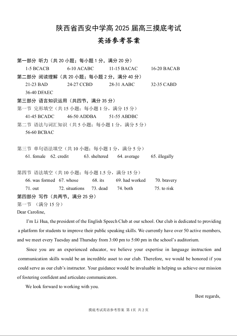 陕西省西安中学高2025届高三摸底考试 英语答案