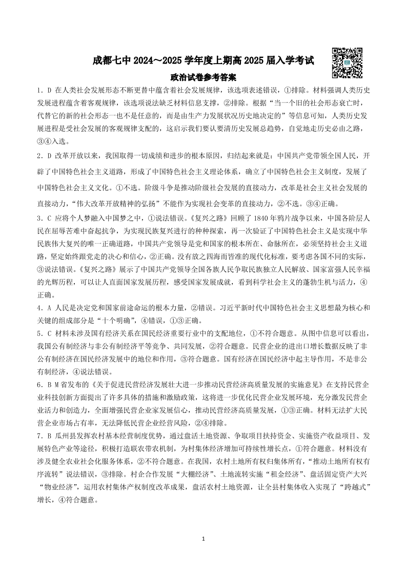 四川省成都市第七中学2024-2025学年高三上学期入学考试 政治答案