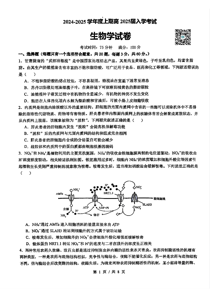 四川省成都市第七中学2024-2025学年高三上学期入学考试 生物