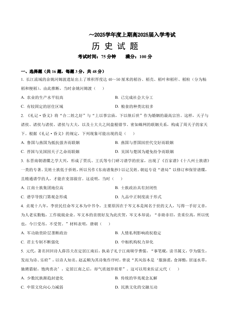 四川省成都市第七中学2024-2025学年高三上学期入学考试 历史