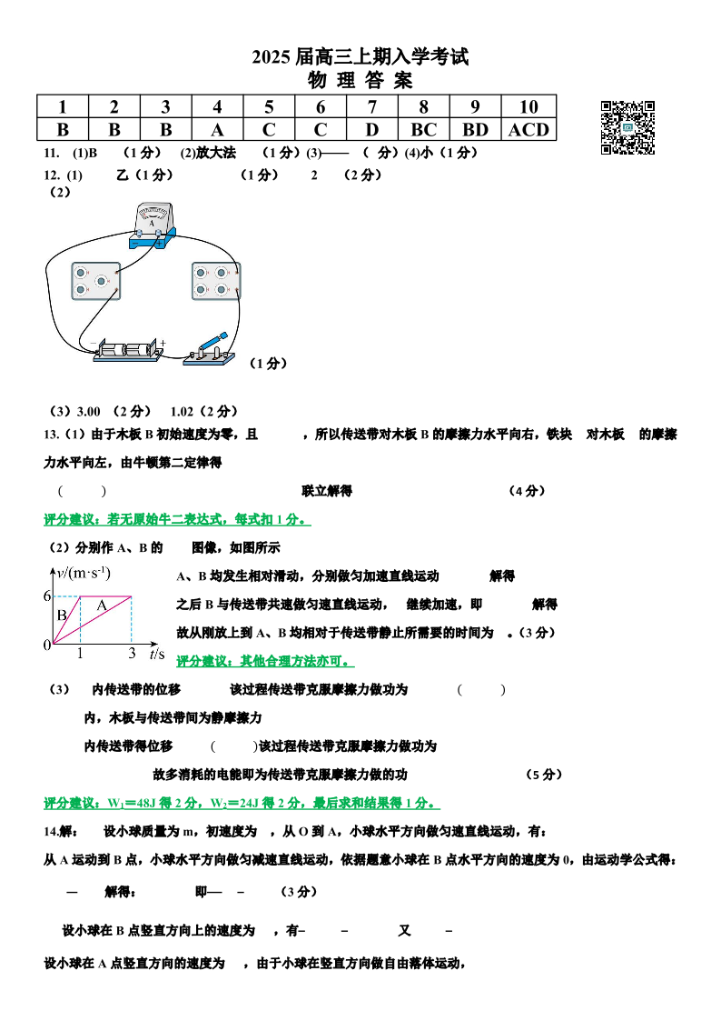 四川省成都市第七中学2024-2025学年高三上学期入学考试 物理答案