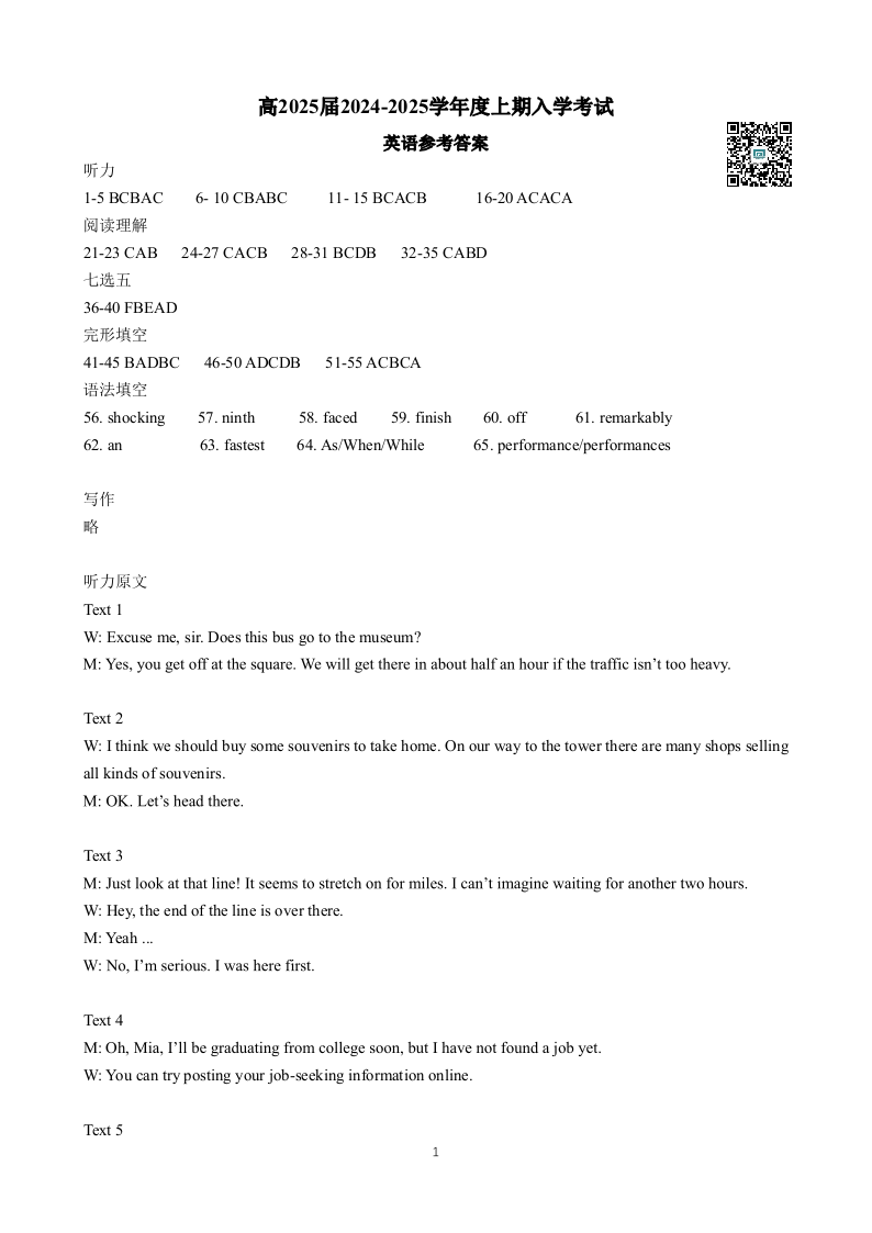 四川省成都市第七中学2024-2025学年高三上学期入学考试 英语答案