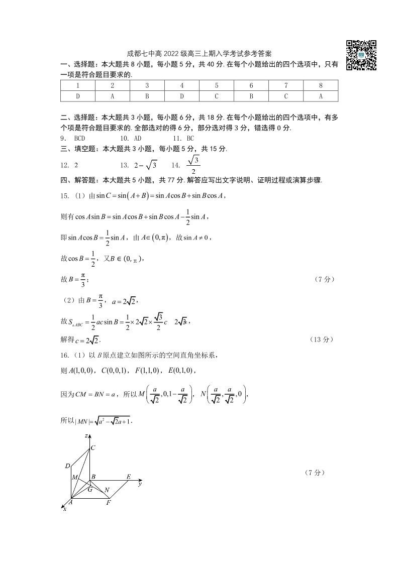 四川省成都市第七中学2024-2025学年高三上学期入学考试 数学答案
