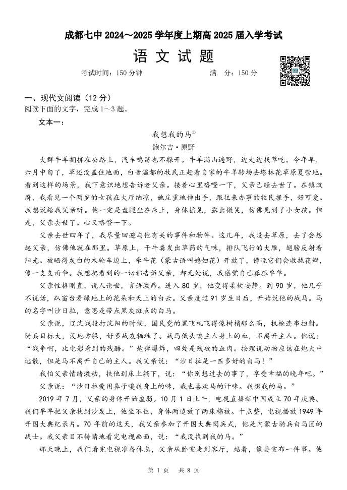 四川省成都市第七中学2024-2025学年高三上学期入学考试 语文