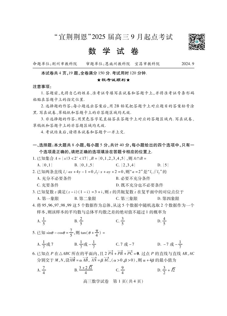 湖北省“宜荆荆恩”2025 届高三9月起点考试 数学
