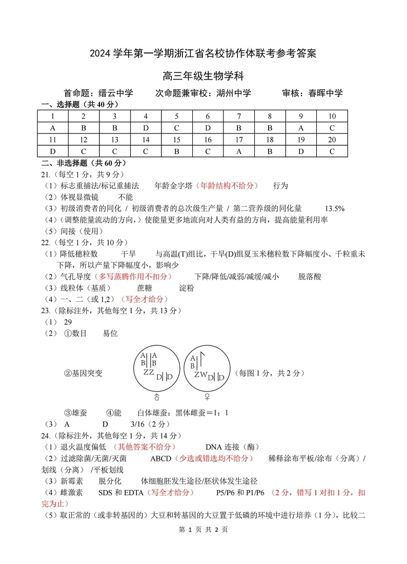 2025届浙江省G12名校协作体高三返校考 生物答案
