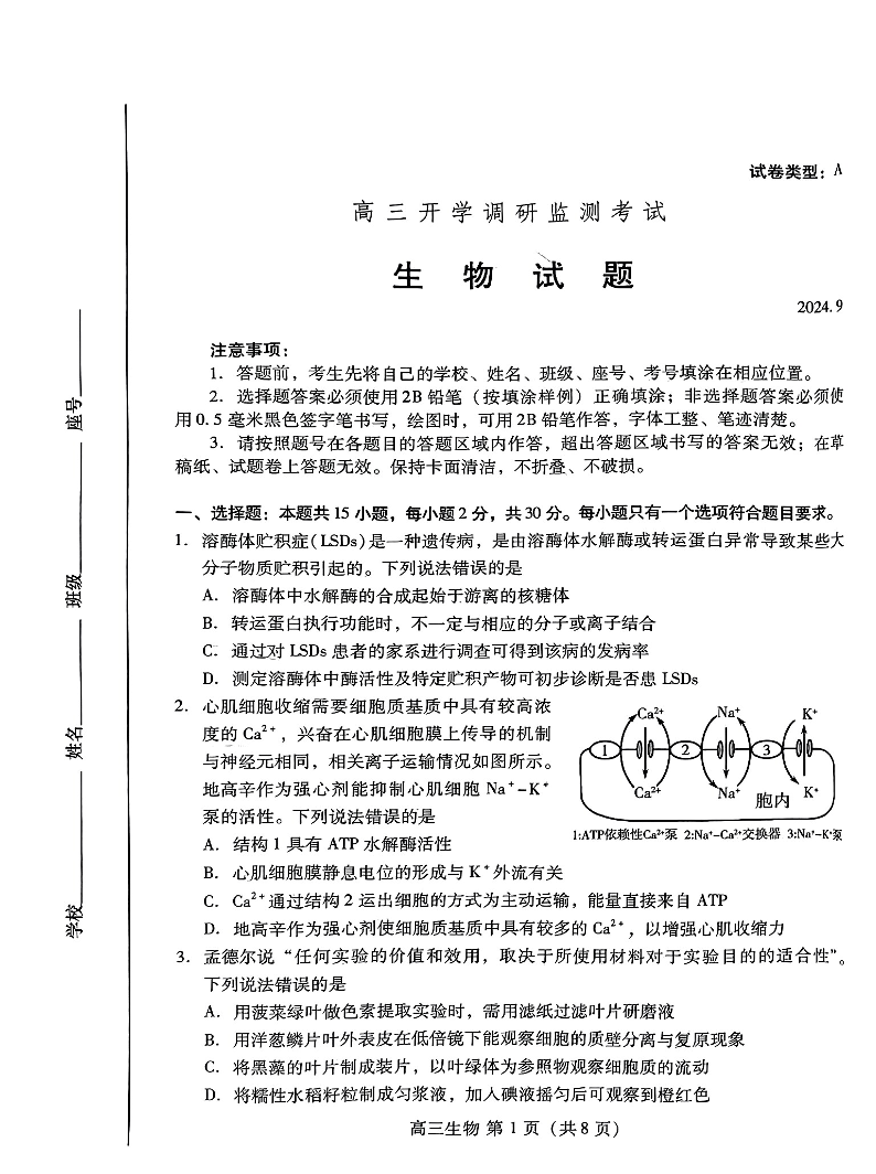 山东省潍坊市2025届高三开学调研监测考试 生物