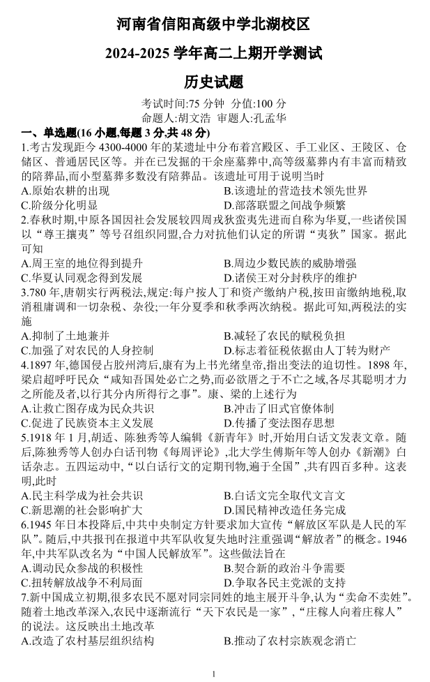 信阳高中北湖校区2024-2025学年高二上学期开学考 历史