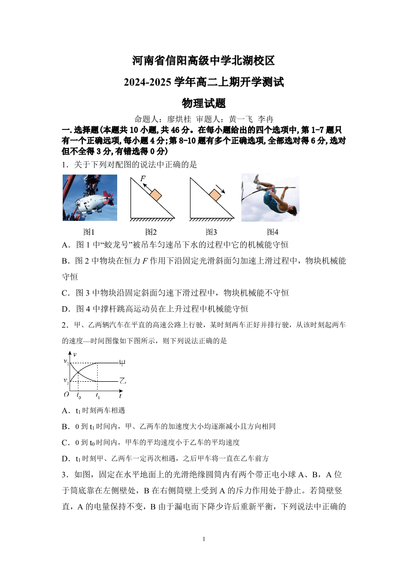 信阳高中北湖校区2024-2025学年高二上学期开学考 物理