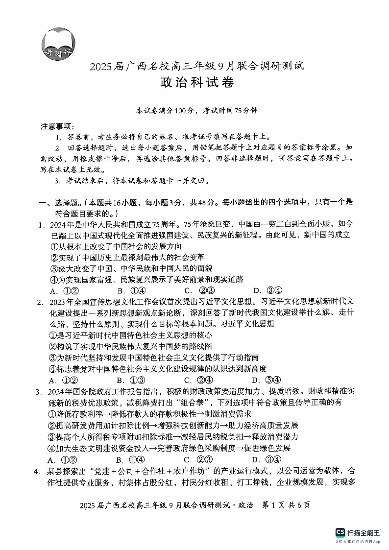 2025届广西名校高三年级9月联合调研测试 政治
