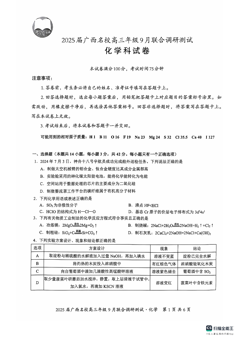 2025届广西名校高三年级9月联合调研测试 化学