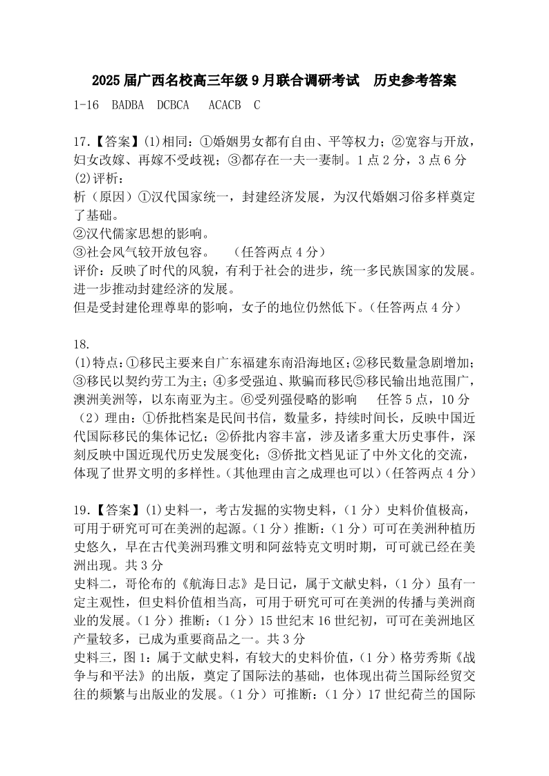 2025届广西名校高三年级9月联合调研测试 历史答案
