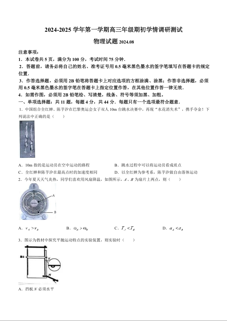 江苏省扬州市2024-2025学年高三上学期开学考试 物理
