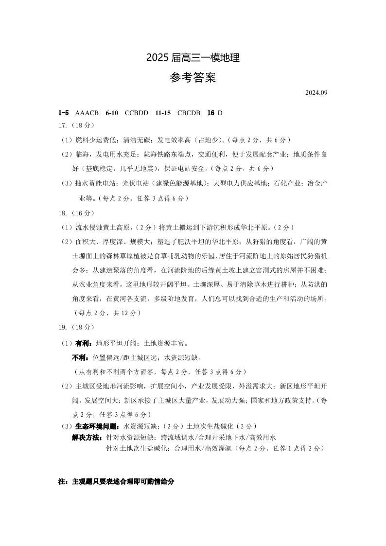 大庆市2025届高三年级第一次教学质量检测 地理答案
