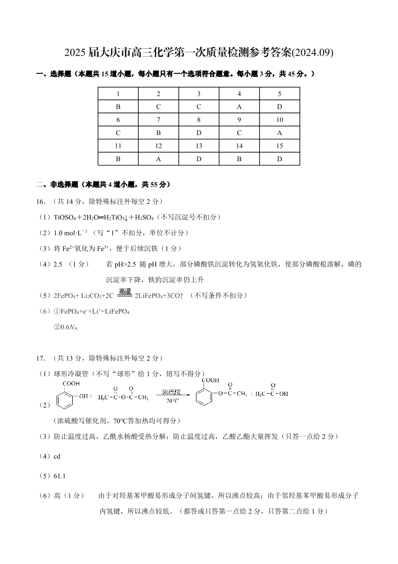 大庆市2025届高三年级第一次教学质量检测 化学答案