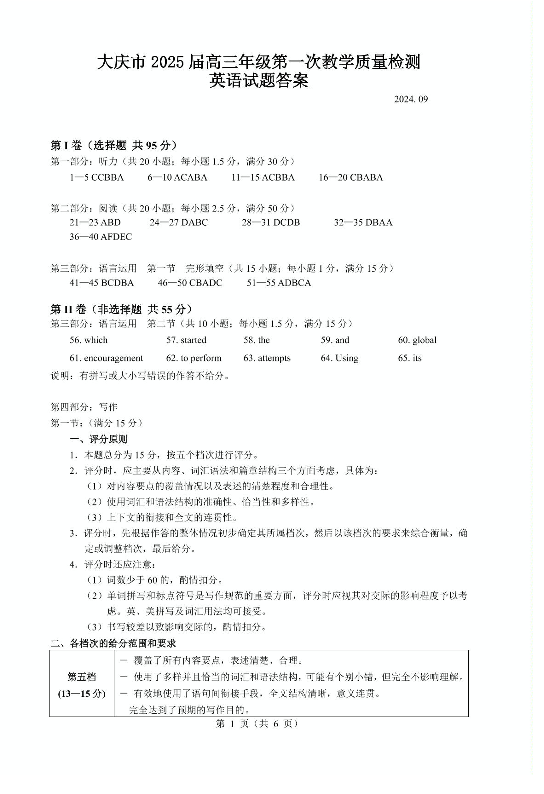 大庆市2025届高三年级第一次教学质量检测 英语答案