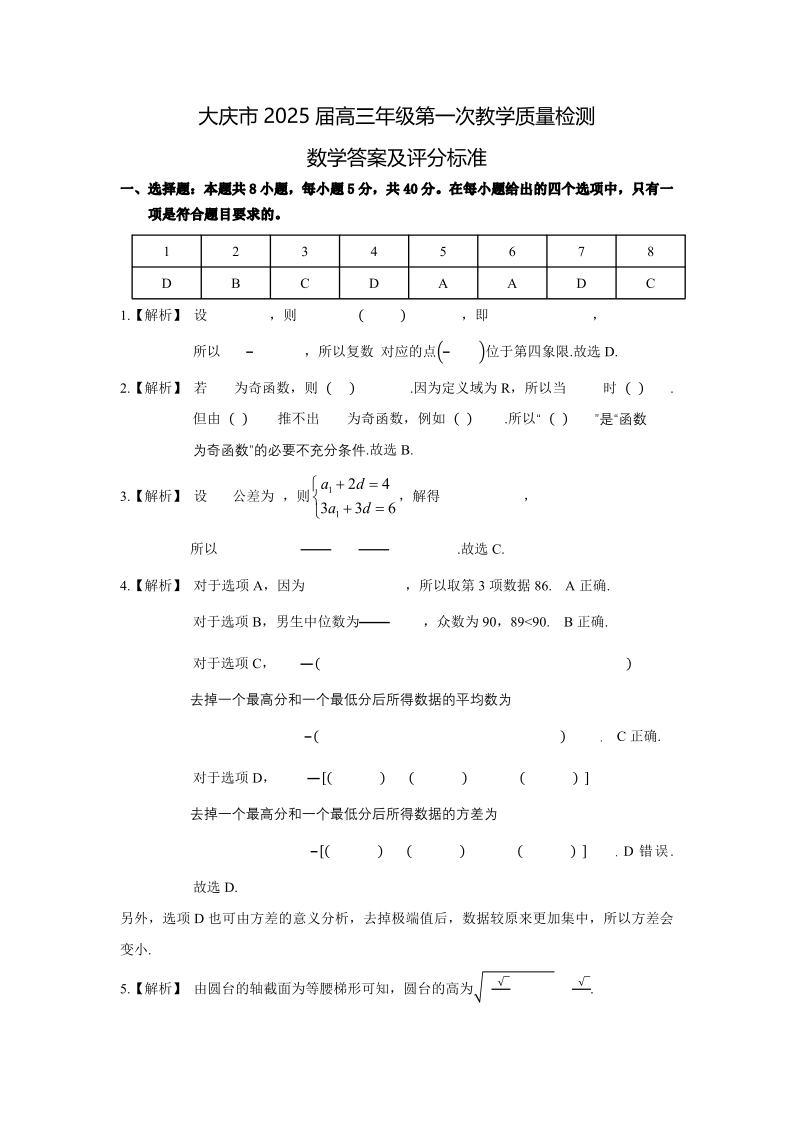 大庆市2025届高三年级第一次教学质量检测 数学答案