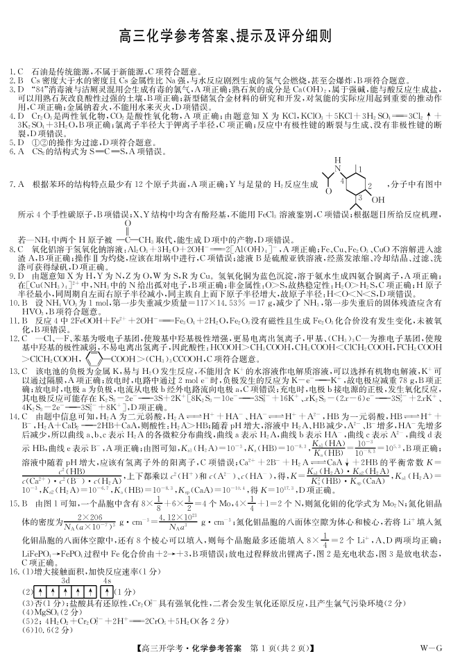 江西省九师联盟2025年高三年级上学期9月联考 化学答案