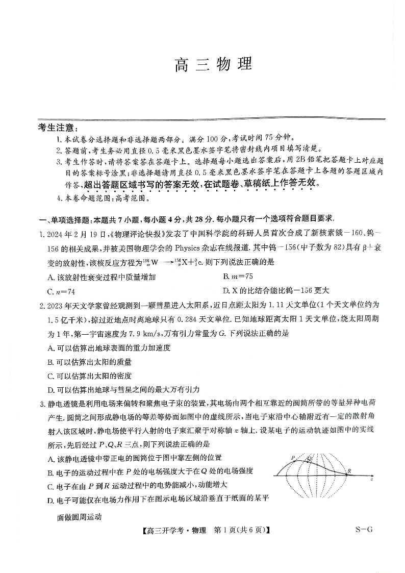 江西省九师联盟2025年高三年级上学期9月联考 物理