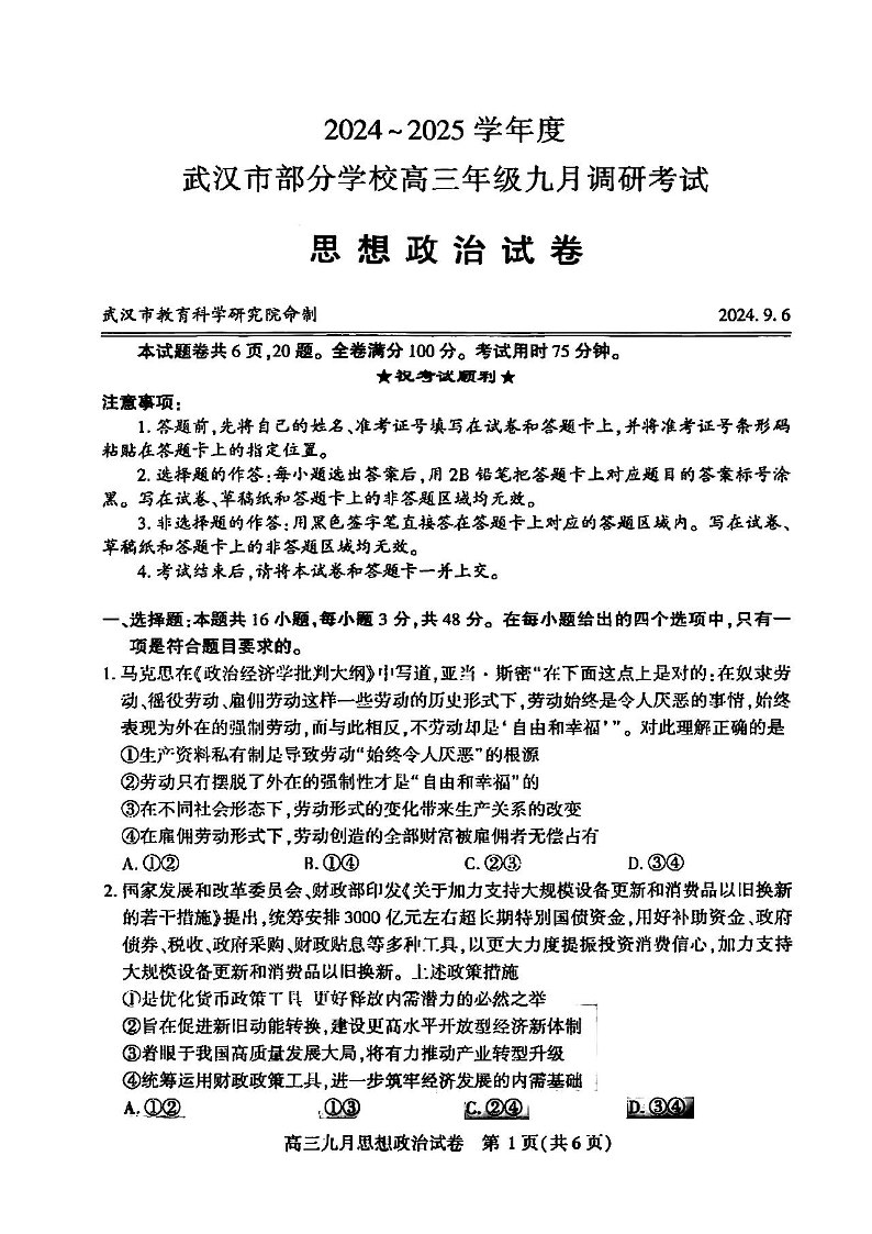 湖北省2024-2025学年度武汉市高三年级九月调研考试 政治