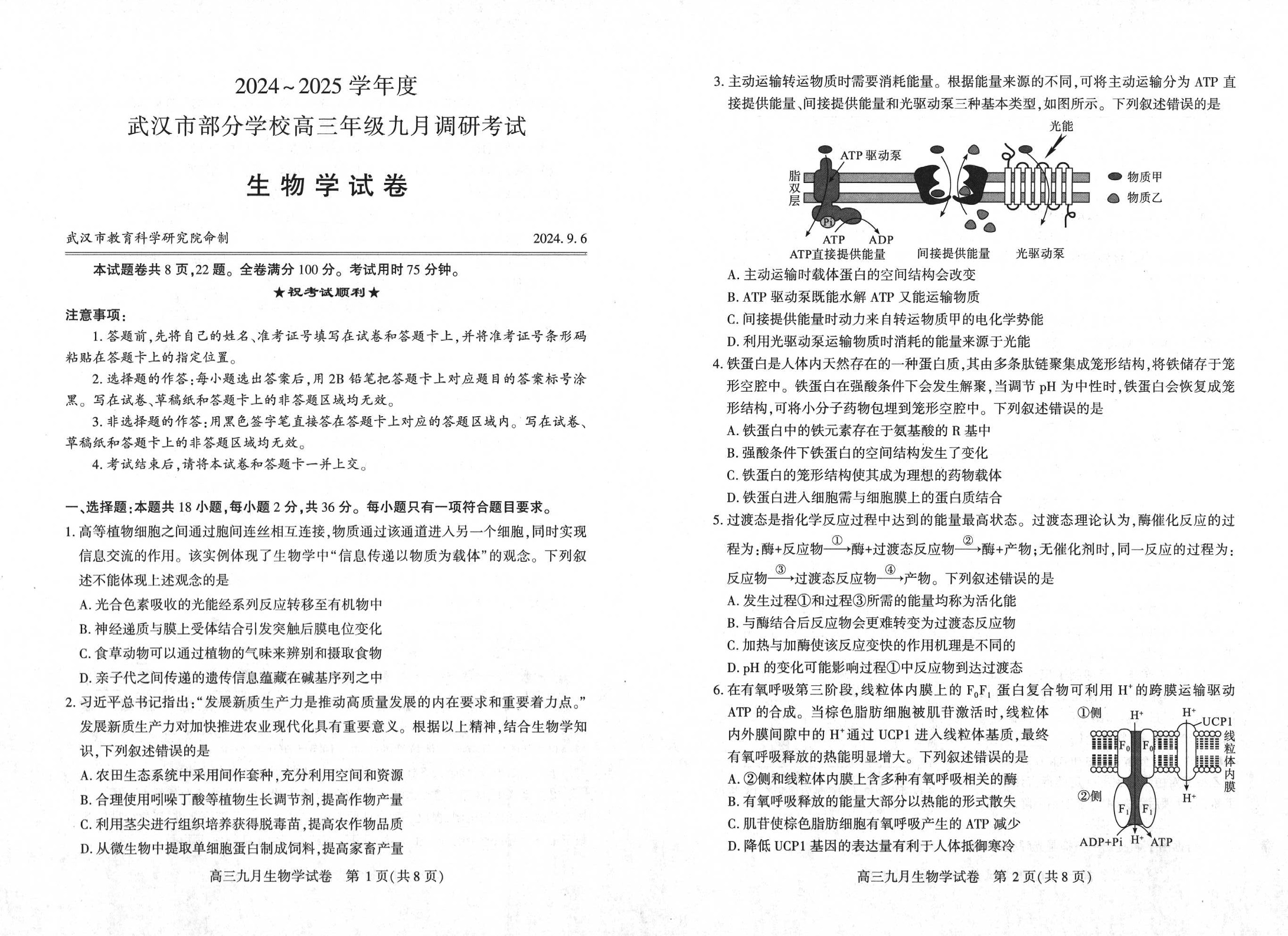 湖北省2024-2025学年度武汉市高三年级九月调研考试 生物