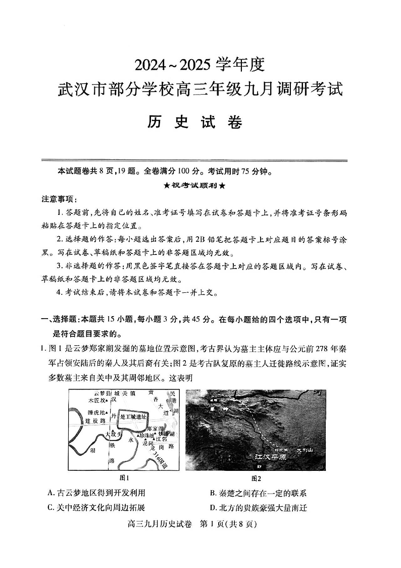 湖北省2024-2025学年度武汉市高三年级九月调研考试 历史