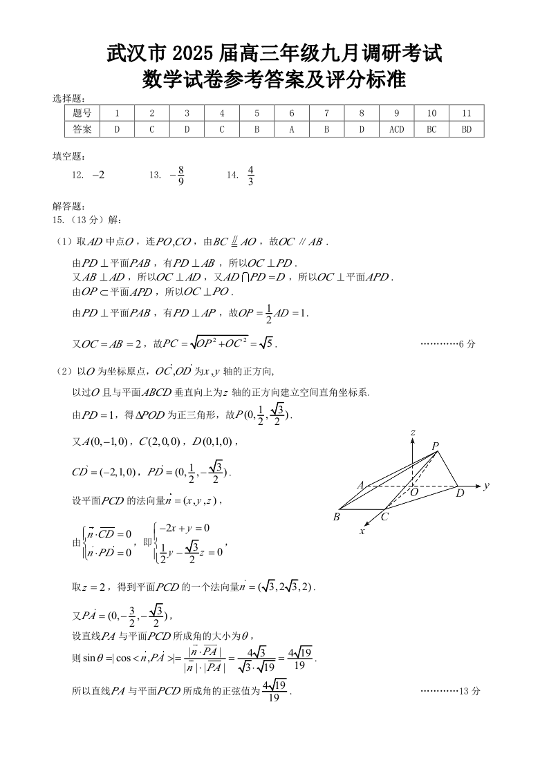 湖北省2024-2025学年度武汉市高三年级九月调研考试 数学答案