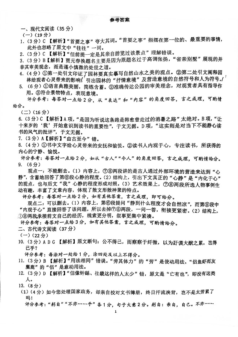 湖北省2024-2025学年度武汉市高三年级九月调研考试 语文答案