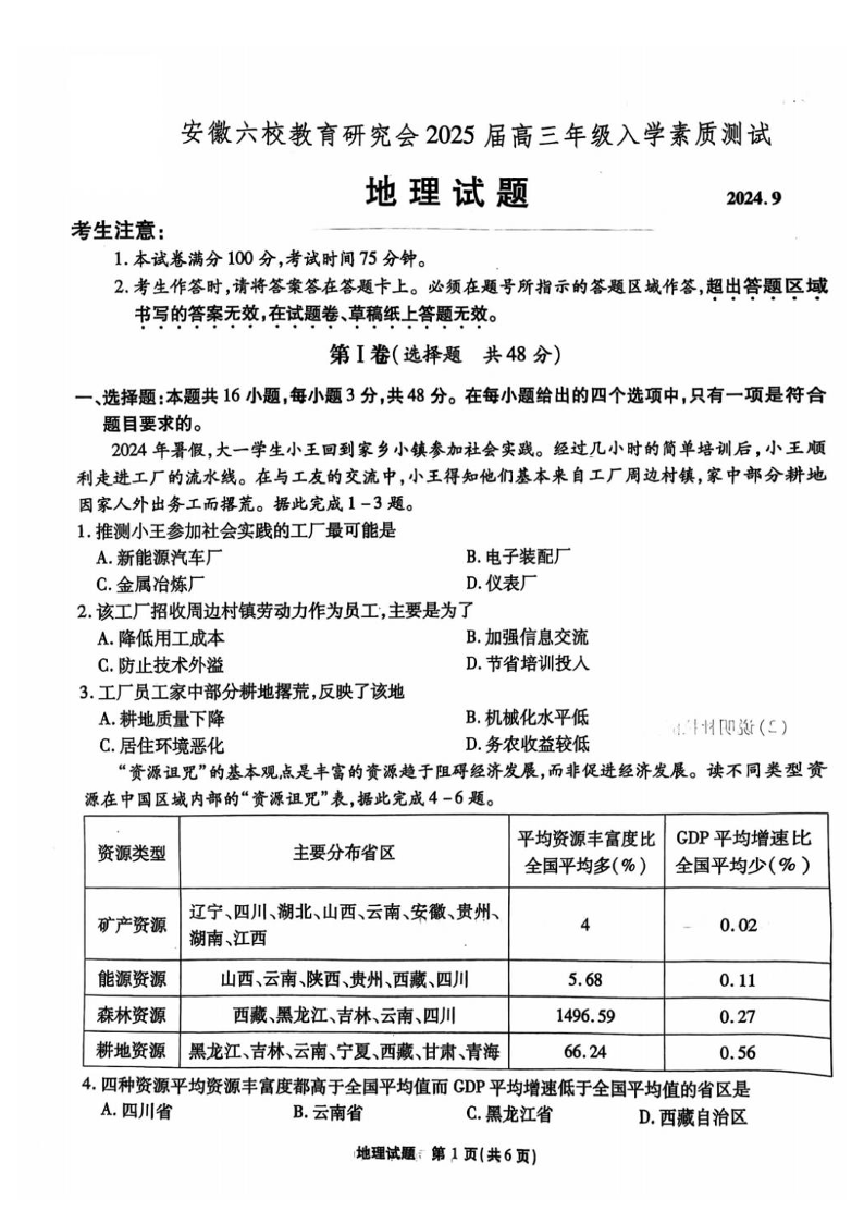 安徽省六校教育研究会2025届高三年级入学素质测试 地理