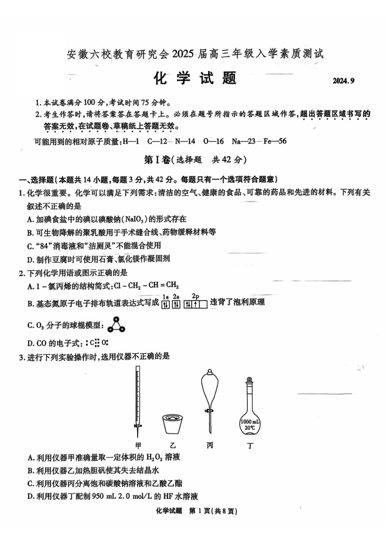安徽省六校教育研究会2025届高三年级入学素质测试 化学