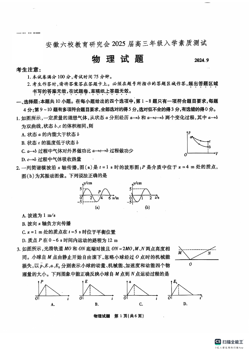 安徽省六校教育研究会2025届高三年级入学素质测试 物理