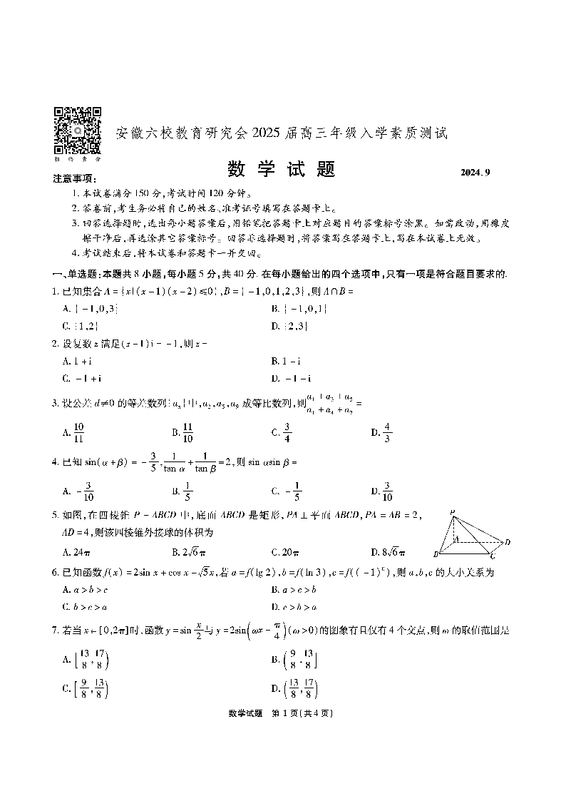 安徽省六校教育研究会2025届高三年级入学素质测试 数学
