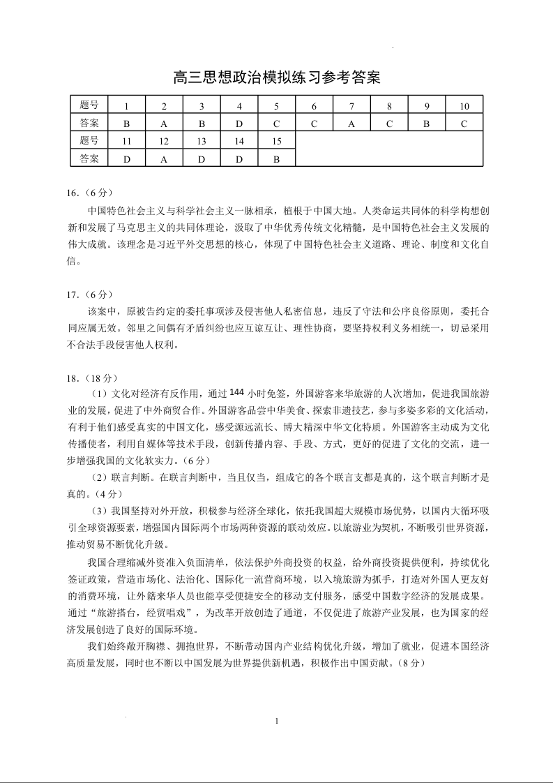 北京市2024-2025学年新高三入学定位考试 政治答案