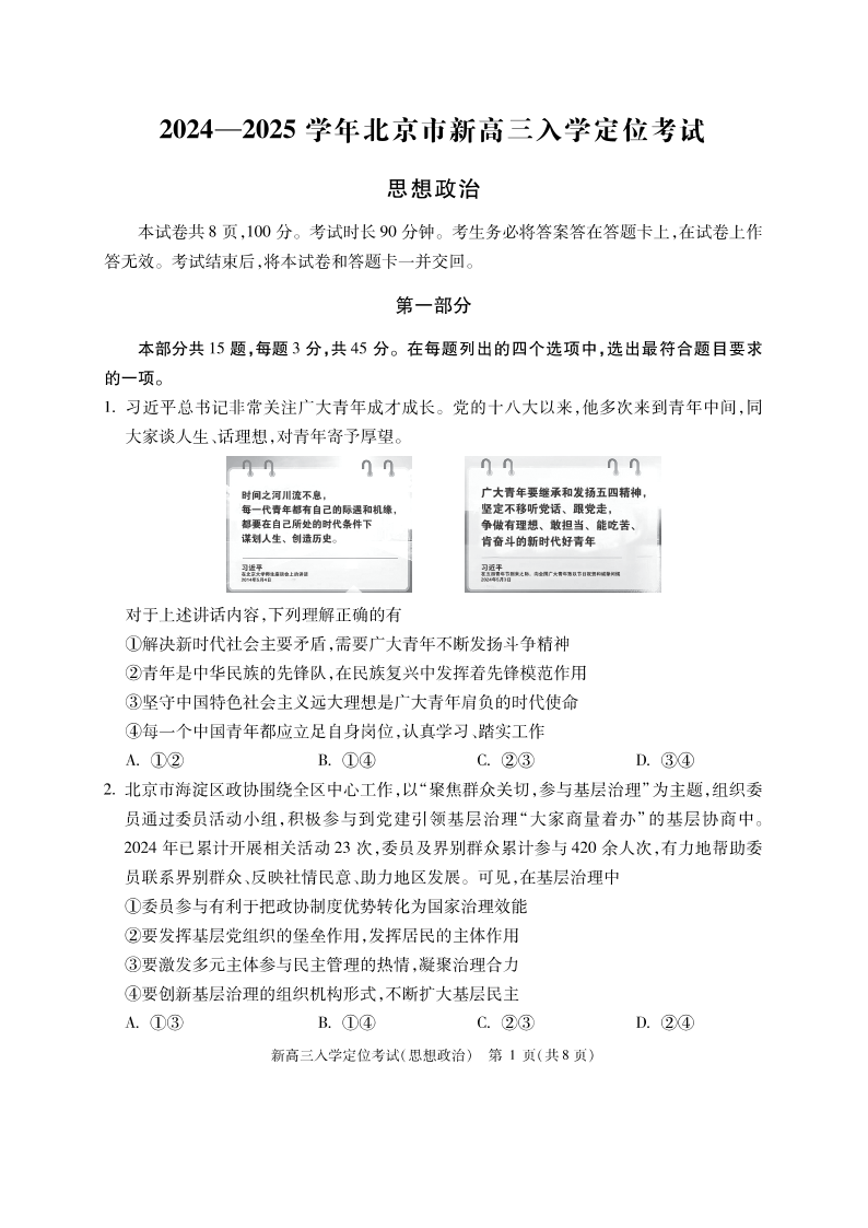 北京市2024-2025学年新高三入学定位考试 政治