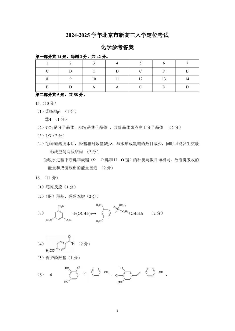 北京市2024-2025学年新高三入学定位考试 化学答案