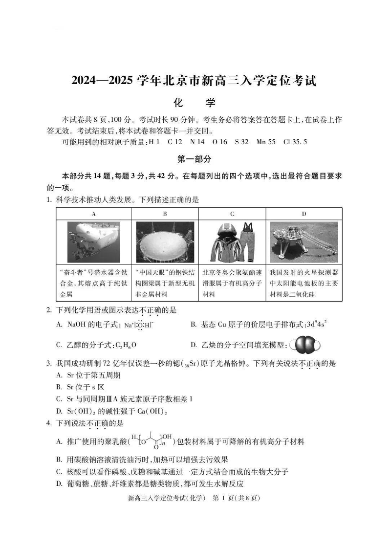 北京市2024-2025学年新高三入学定位考试 化学