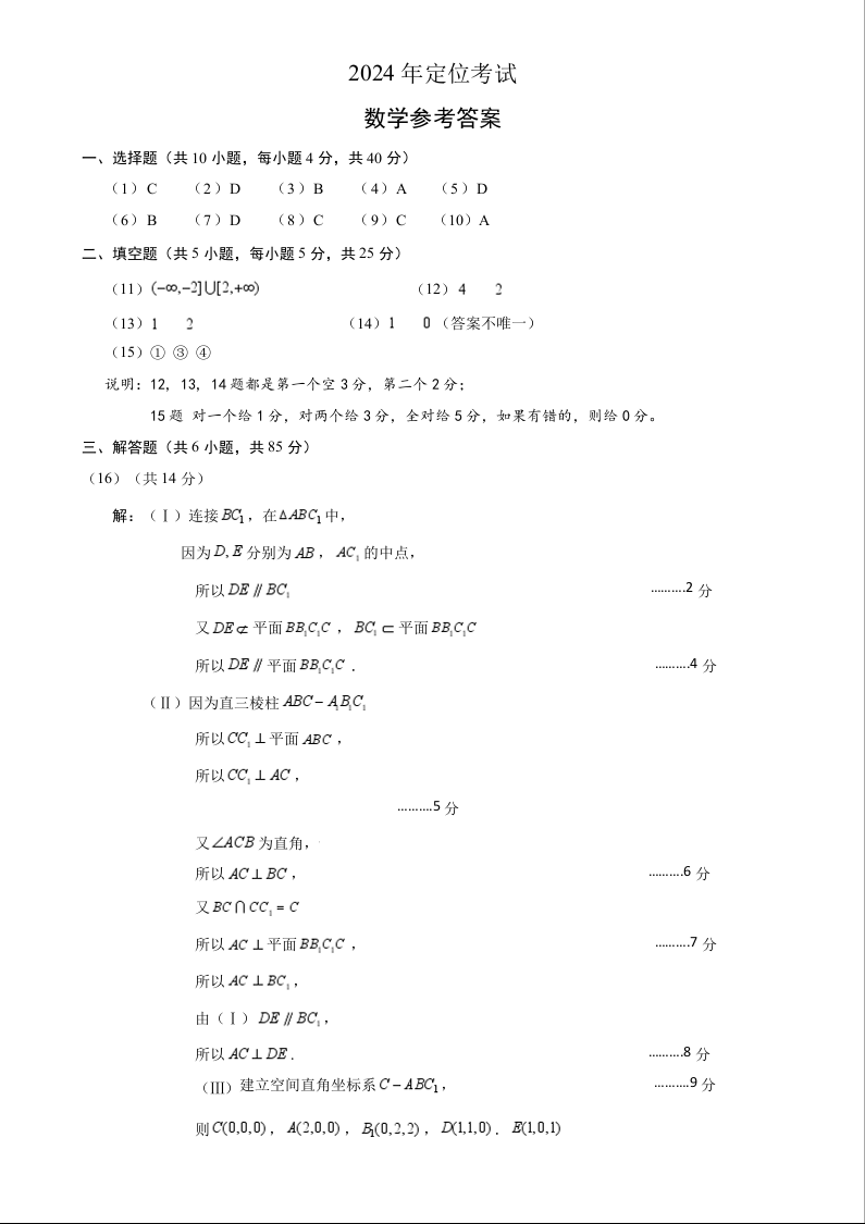 北京市2024-2025学年新高三入学定位考试 数学答案