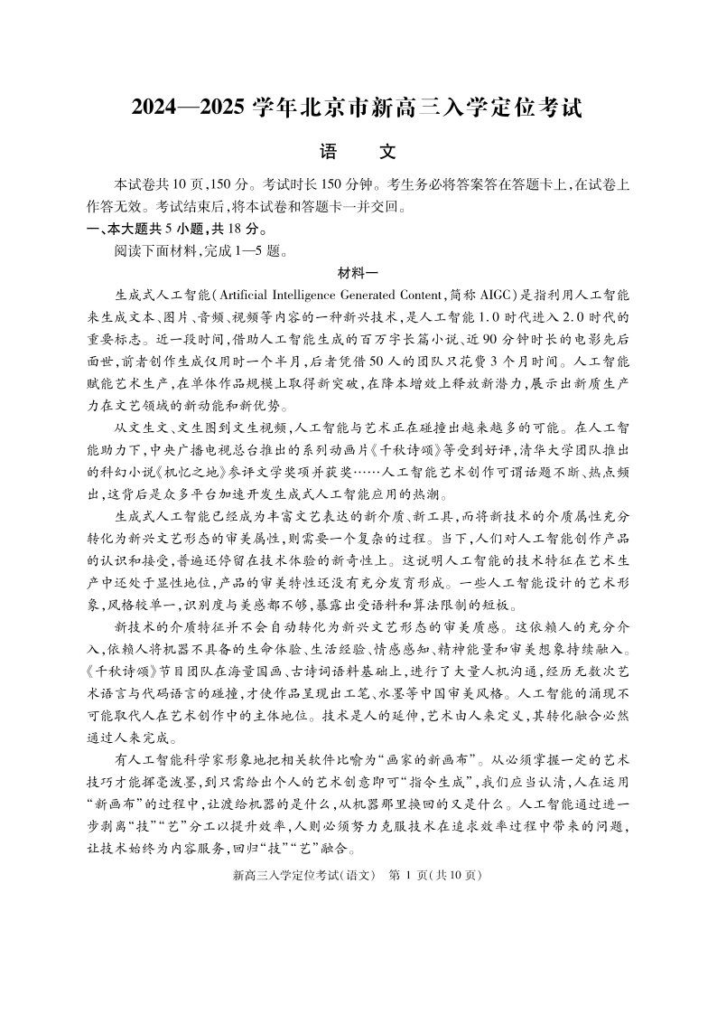 北京市2024-2025学年新高三入学定位考试 语文