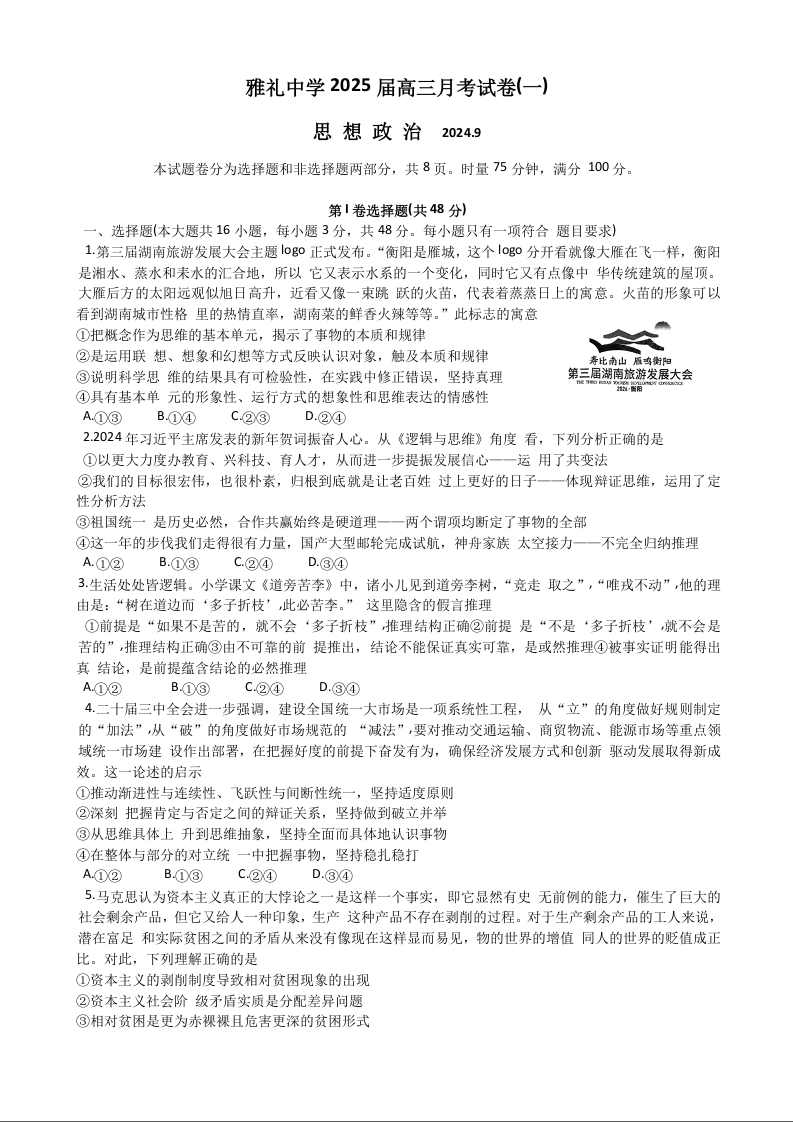 湖南省雅礼中学2025届高三月考试卷(一)政治