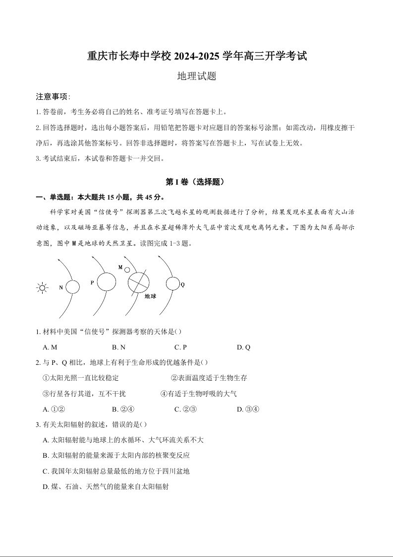 重庆市长寿中学校2024-2025学年高三开学考试 地理
