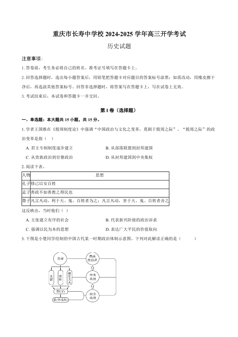 重庆市长寿中学校2024-2025学年高三开学考试 历史