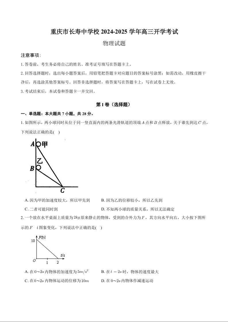 重庆市长寿中学校2024-2025学年高三开学考试 物理