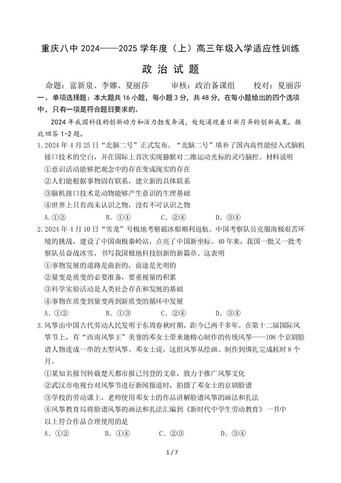 重庆市第八中学2024-2025学年高三上学期入学适应性训练 政治