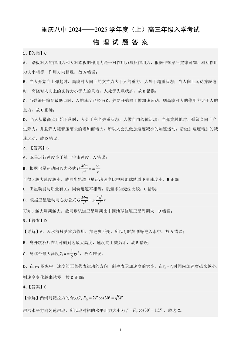 重庆市第八中学2024-2025学年高三上学期入学适应性训练 物理答案