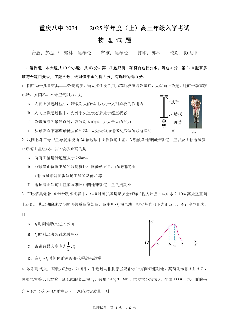重庆市第八中学2024-2025学年高三上学期入学适应性训练 物理